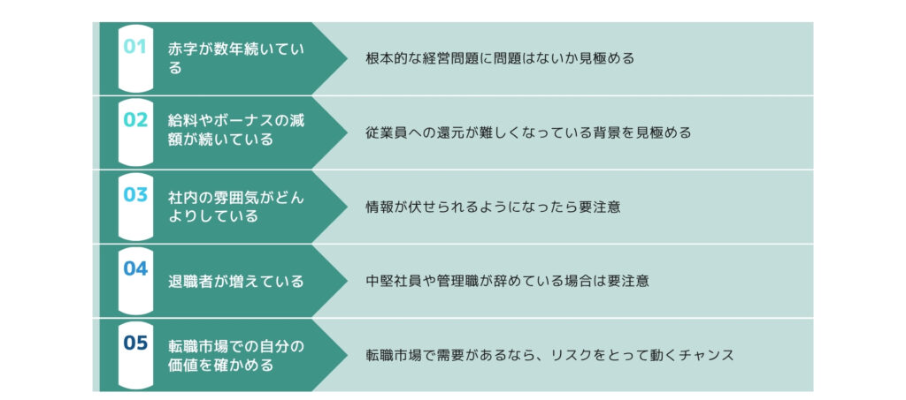 それでは、会社が赤字のときに「今が辞めどき」と判断するためのポイントを5つご紹介します。