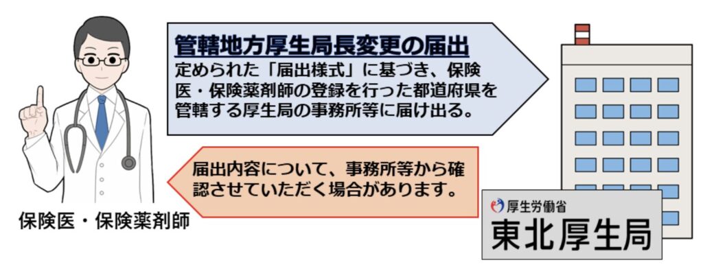 地方厚生局の管轄が変わる都道府県へ異動・転職する場合、保険医・保険薬剤師管轄地方厚生(支)局長変更届の提出が必要です。