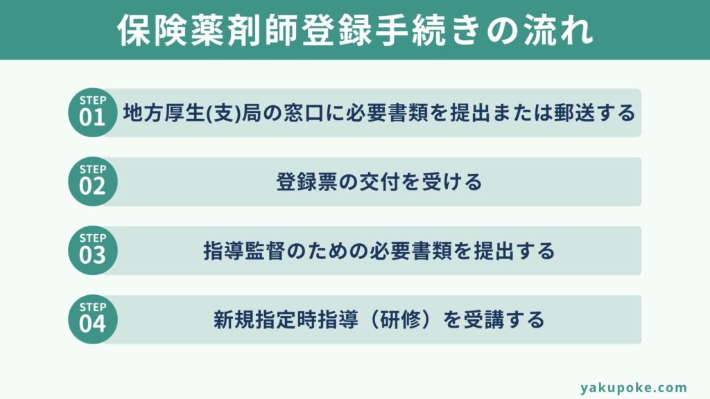 保険薬剤師の登録手続きの流れを、以下の図にまとめました。